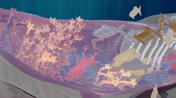 The project consists of three posters and an animation. These posters explore the phenomenon of a 'whale fall', where the carcass of a whale provides a unique opportunity for life in the deep, dark ocean. A ‘whale fall’ occurs when the carcass of a whale has fallen onto the ocean floor at a depth greater than 1,000 meters. Despite the initial sadness of a whale's death, the ecological impact of a whale fall demonstrates the interconnectedness and resilience of marine ecosystems. The animation shows the whale falling, using the relationship between the death of the whale and the lives of other marine animals to convey the concept of the multifaceted sides of things.